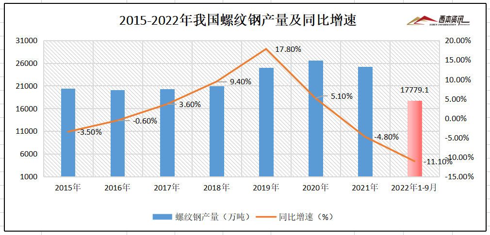 据国家统计局数据,2022年9月份,我国钢筋产量2141.8万吨,同比增长17.4%;1-9月份,我国钢筋产量17779.1万吨,同比下降11.1%。2022年9月份,我国线材(盘条)产量1296.4万吨,同比增长17.4%;1-9月份,我国线材(盘条)产量10781.6万吨,同比下降9.4%。(见下图)
