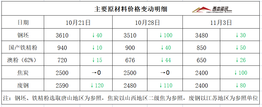 11月4日西本钢铁原料价格走势预警报告