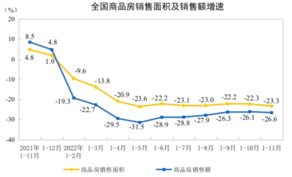 图18:2022年1-11月全国商品房销售面积及销售额增速