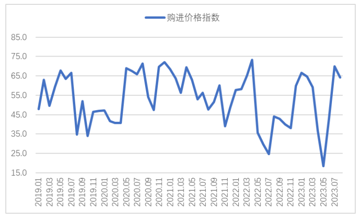 8月份,原材料采购活动加快收缩,导致7月以来的原材料价格快速上升势头有所放缓。购进价格指数为64.1%,环比下降5.8个百分点。分品类来看,各类原料价格涨跌互现,表现最强的焦炭延续7月份以来的涨势,其价格再度上涨。铁矿石价格呈现v字态势,在平控预期的作用下,铁矿石采购量下滑,市场价格承压,但临近月末时由于具体政策措施未落地,铁矿价格开始报复性反弹,几乎收回月内跌幅。废钢价格随着成材价格下降也有所下滑。综合来看,原材料价格虽然上涨势头有所减缓,但依旧给钢厂带来一定的成本压力,部分品种盈利空间再度压缩。