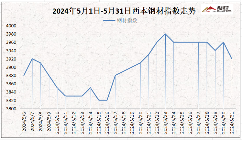 截止5月31日,西本钢材指数收在3920,较上月末上涨40,较去年同期价格大涨170,较去年同期上涨4.47%。