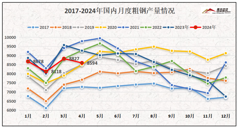 从钢厂生产情况来看,国家统计局数据显示,2024年4月份,我国粗钢产量8594万吨,同比下降7.2%;4月份全国粗钢日均产量286.47万吨,环比上升0.61%;1-4月,我国粗钢产量34367万吨,同比下降3%。