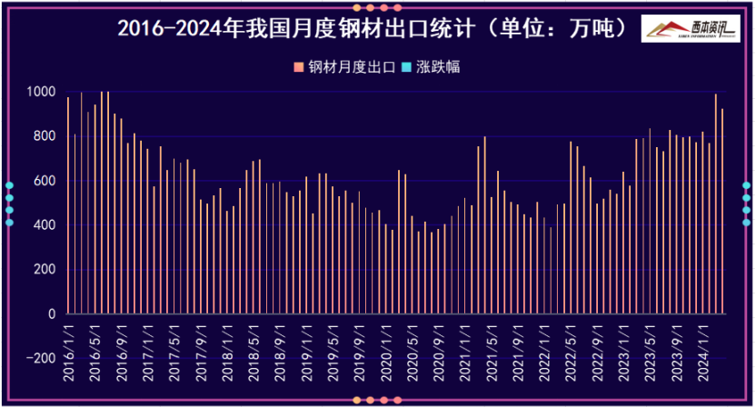 从钢材进出口数据来看,海关总署数据显示,2024年4月中国出口钢材922.4万吨,较上月减少66.4万吨,环比下降6.7%;1-4月累计出口钢材3502.4万吨,同比增长27%。4月中国进口钢材65.8万吨,较上月增加4.1万吨,环比增长6.6%;1-4月累计进口钢材240.5万吨,同比下降3.7%。