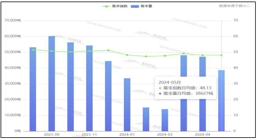 5月中上旬,高炉开工率小幅提升,建材供应量小幅增加。然而,房地产投资持续下滑,以及华南地区持续暴雨天气,建筑钢市交易呈现疲态。5月下旬,钢厂盈利减少1.3%至52.81%,铁水达产量见顶转降,终端需求不及预期,虽政策利多加码托底,但需求多数情况依旧不理想,社会库存降幅持续放缓。由此可见,5月份钢材需求量环比下降。即将踏入6月份,我国将全面进入汛期,南方将进入主汛期,高温雨水影响户外施工,届时,下游表观需求量将受到影响。据钢小二平台采样数据显示,5月份螺纹钢需求指数月环比下降18%。