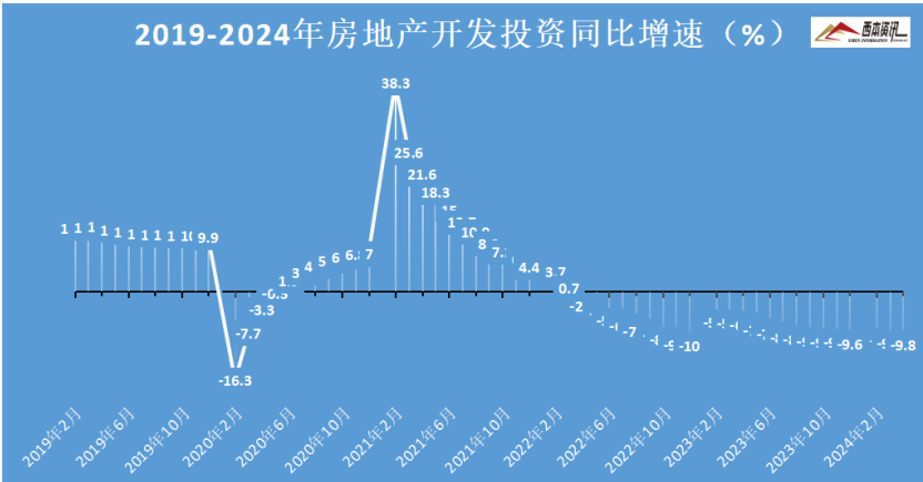 1-4月份,全国房地产开发投资30928亿元,同比下降9.8%;其中,住宅投资23392亿元,下降10.5%。1-4月份,房地产开发企业房屋施工面积687544万平方米,同比下降10.8%。其中,住宅施工面积480647万平方米,下降11.4%。房屋新开工面积23510万平方米,下降24.6%。房屋竣工面积18860万平方米,下降20.4%。