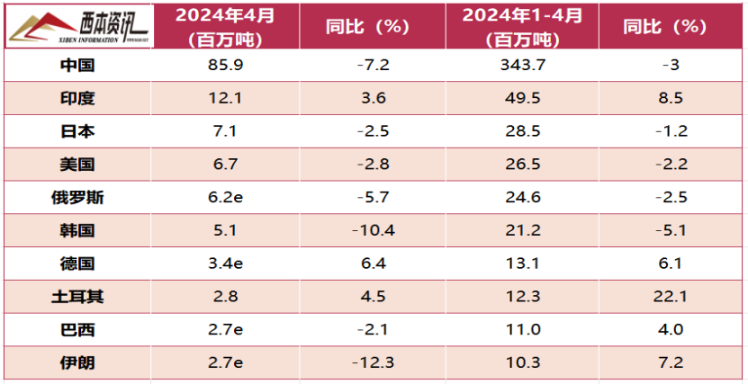 2024年4月,中国粗钢产量为8594万吨,同比下降7.2%;印度粗钢产量为1210万吨,同比提高3.6%;日本粗钢产量为710万吨,同比下降2.5%;美国粗钢产量为670万吨,同比下降2.8%;俄罗斯粗钢预估产量为620万吨,同比下降5.7%;韩国粗钢产量为510万吨,同比下降10.4%;德国粗钢预估产量为340万吨,同比提高6.4%;土耳其粗钢产量为280万吨,同比提高4.5%;巴西粗钢预估产量为270万吨,同比下降2.1%;伊朗粗钢预估产量为270万吨,同比下降12.3%。