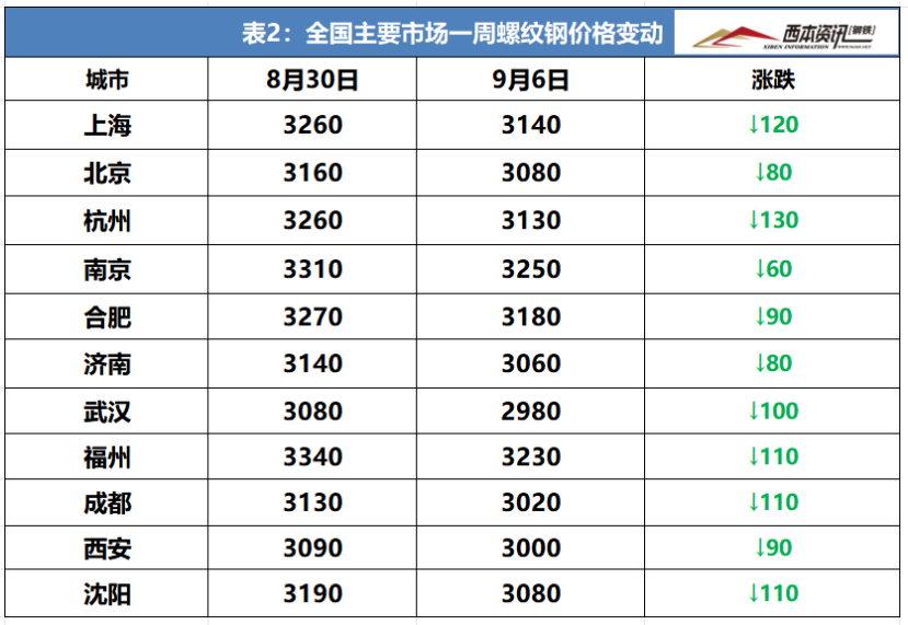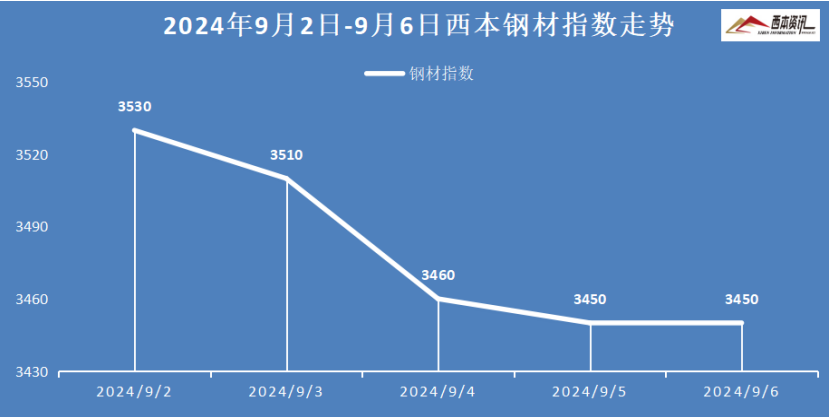 本周国内建筑钢材大幅下跌,截至9月6日,西本指数报在3450,较上周五下跌90。