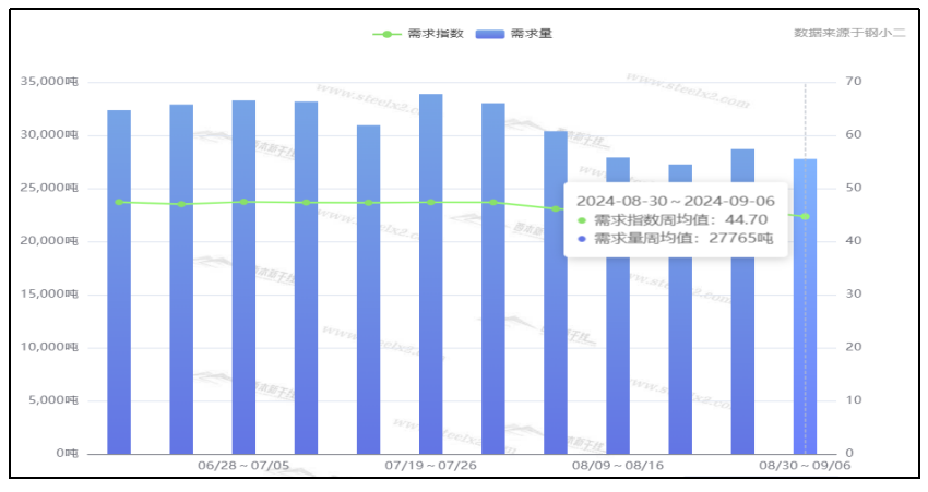 从终端需求来看,据钢小二平台周均值数据显示,9月5日全国工程需求量周均值为27765吨,环比周均值下跌3.2%。其中,上海周均值13164吨,环比周均值微降;广州2176吨,环比周均值微降;杭州2819吨,环比周均值下降。工程需求pmi为45,需求略差。