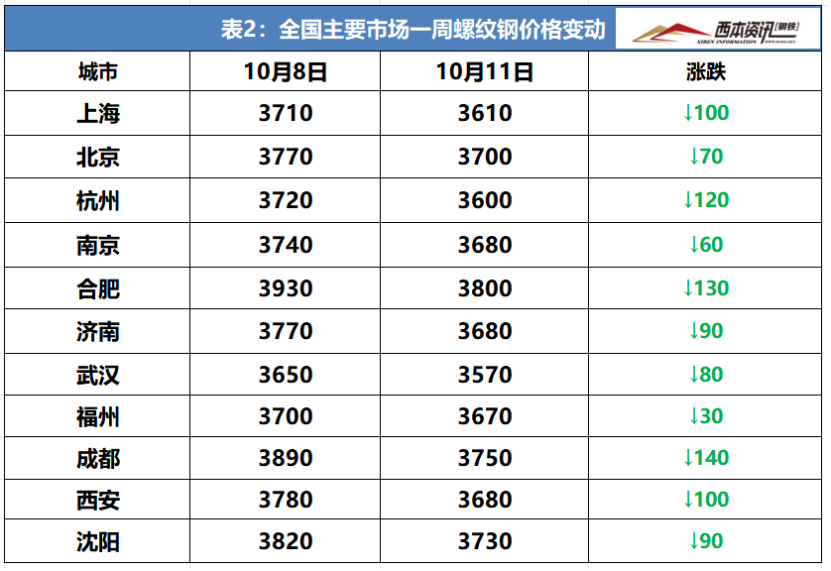 本周国内建筑钢材连续下跌,截至10月11日,西本指数报在3850,周环比下跌100。