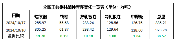 据西本资讯历史数据,当前库存总量较上年同期(2023年10月19日的1080.78万吨)减少195.57万吨,降幅为18.10%。分品种看,本期五大钢材品种库存中,所有品种库存环比下降。(见下图)