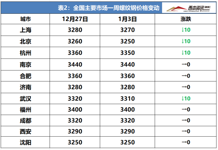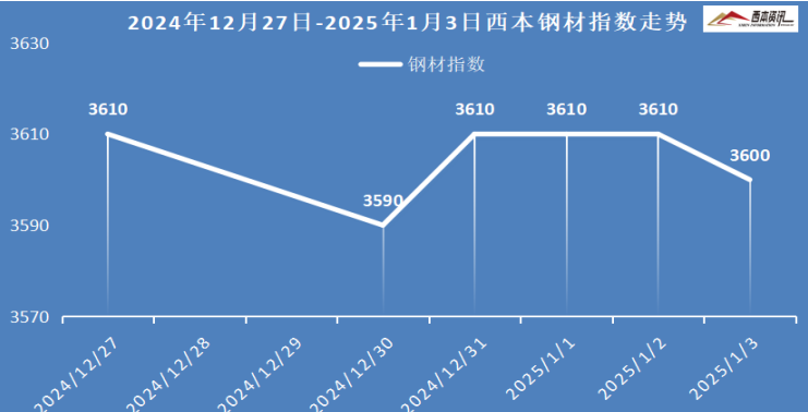 本周国内建筑钢材小幅波动,截至1月3日,西本指数报在3600,周环比下跌10。