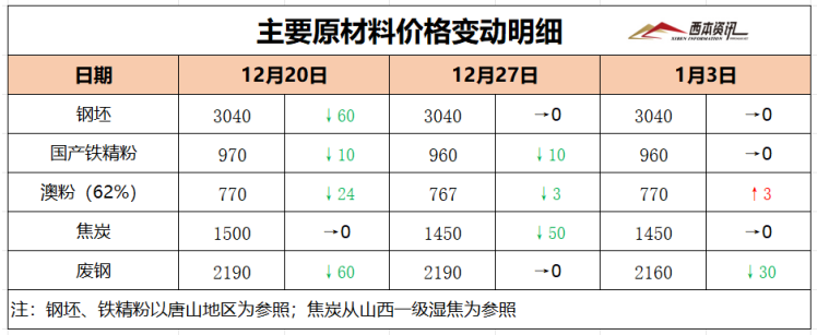 本周国内主要原料相对平稳,其中,进口矿价微幅波动,钢坯行情窄幅震荡,国产矿以稳为主,焦炭价格跌后平稳,废钢价格小幅下跌,分品种来看: