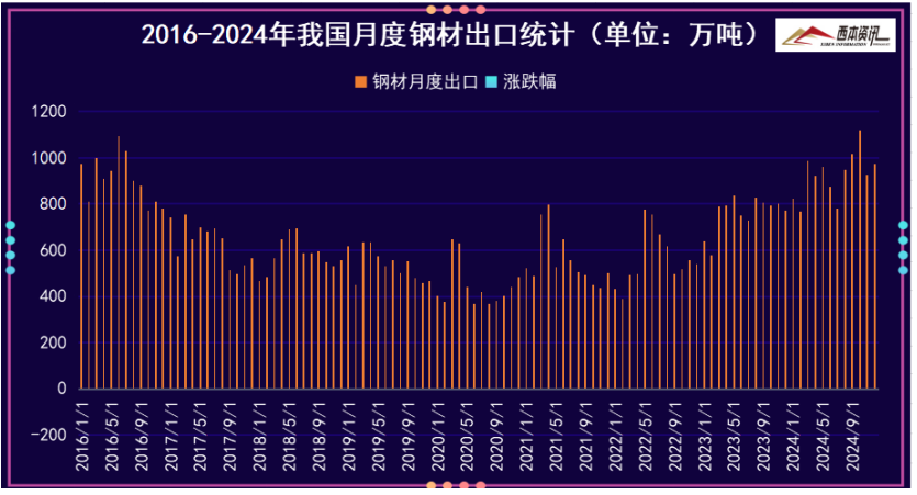 从钢材进出口数据来看,海关总署数据显示,2024年12月中国出口钢材972.7万吨,较上月增加44.9万吨,环比增长4.8%;1-12月累计出口钢材11071.6万吨,同比增长22.7%。12月中国进口钢材62.1万吨,较上月增加14.8万吨,环比增长31.3%;1-12月累计进口钢材681.5万吨,同比下降10.9%。