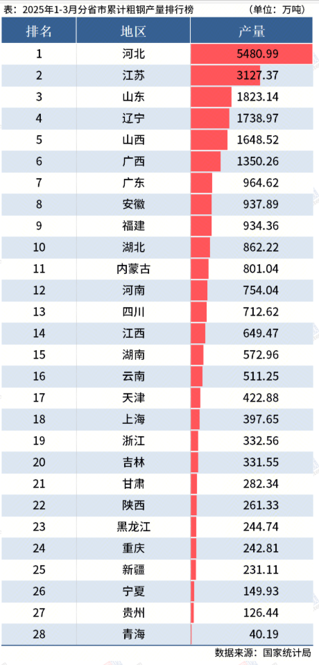 从分省市数据来看,2025年1-3月河北以产量5480.99万吨位列第一;江苏产量3127.37万吨排在第二;山东产量1823.14万吨排在第三。