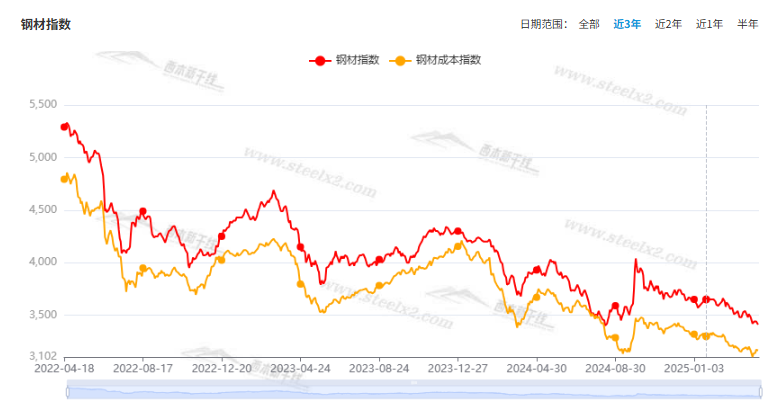 本期,全国各地市场建筑钢材价格震荡偏弱:其中,北方钢厂托举,小幅起落;南方期货引领,窄幅上下。本周西本钢材指数小跌,成本指数小涨,显示长流程钢厂利润空间受限;本周螺纹钢期货主力合约低位起伏,对现货市场有示范效应。(下图为红色线条为钢材指数,黄色线条为成本指数)