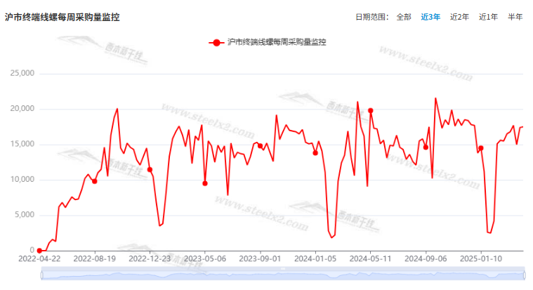 本期,西本资讯监测的沪市线螺周终端采购量为1.75万吨,周环比增加0.57%(见下图)。本周,终端需求环比变化不大,显示刚需总体平缓。